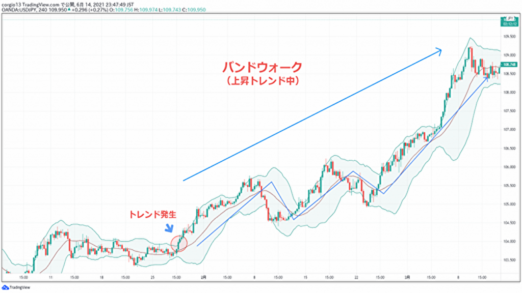 バンドウォーク時は、トレンドラインなどのテクニカル分析を使い、押し目買いなどを有利に行う事が出来ます!