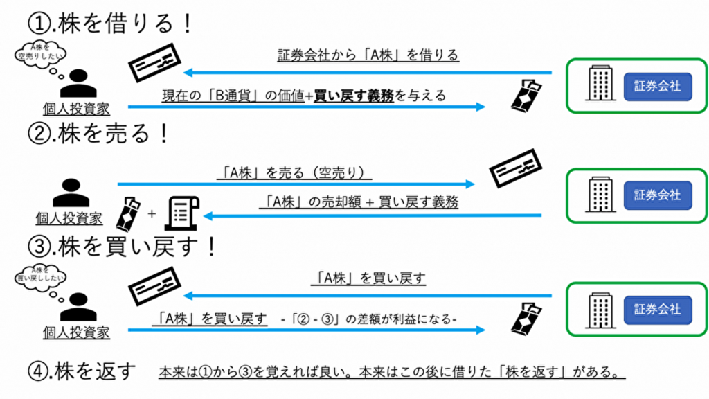 上の図のように、株の空売りは基本この3つの流れで行われます。実際には、最後に「④株を返す」があります。