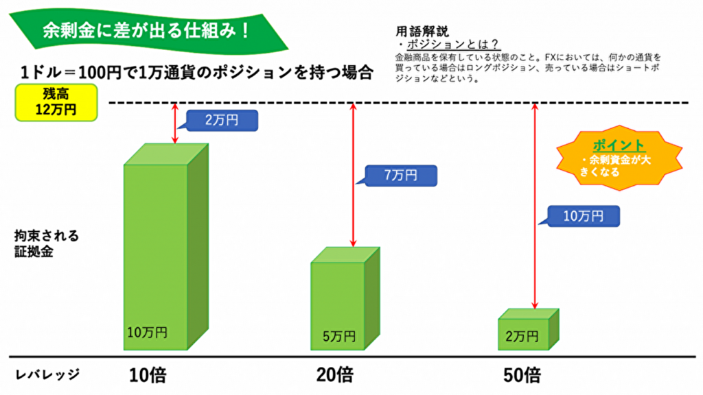 以上の事から、レバレッジは、高い方が拘束される資金が少なく済むと言えます。余剰資金が多ければ耐えれる含み損も多くなり、また、その資金で他のポジションも保有できるとも言えます。