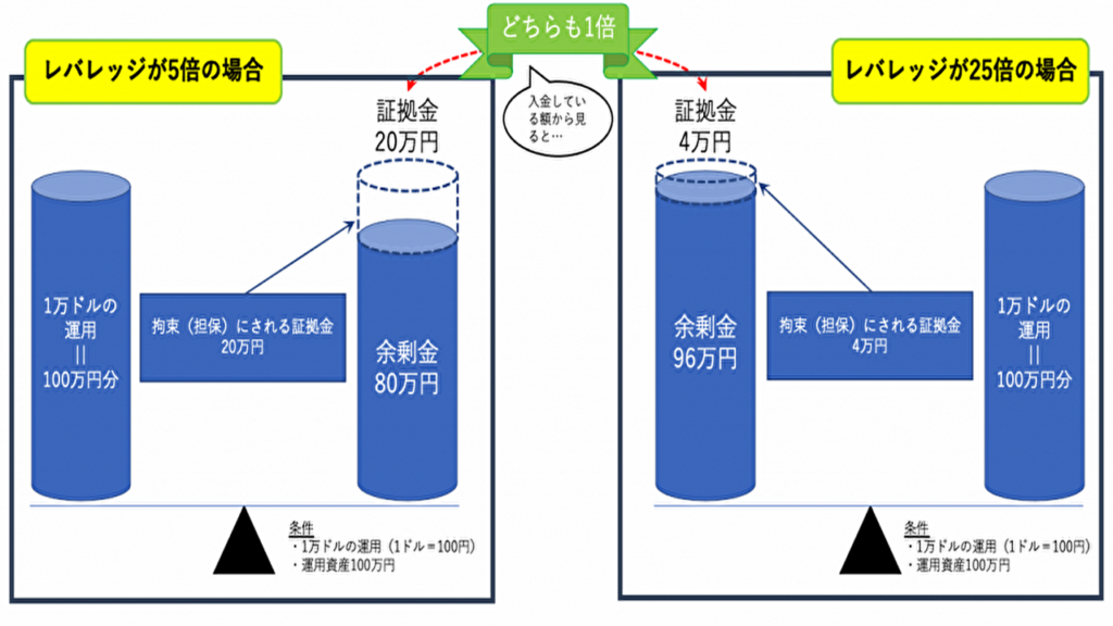 上の図は、レバレッジの違いで入金面で見れば等倍なのに余剰金に差が出る仕組みを表しています。