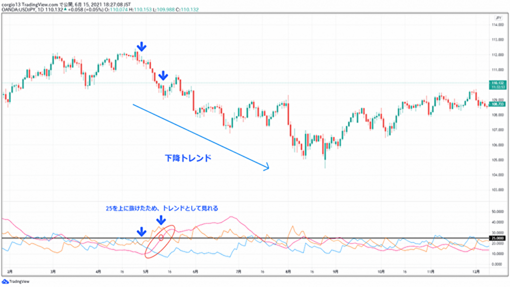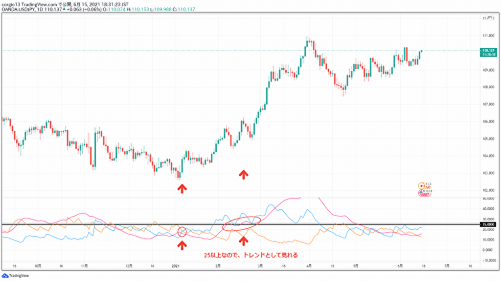 ADXが25以上に進めば、トレンド発生となる。